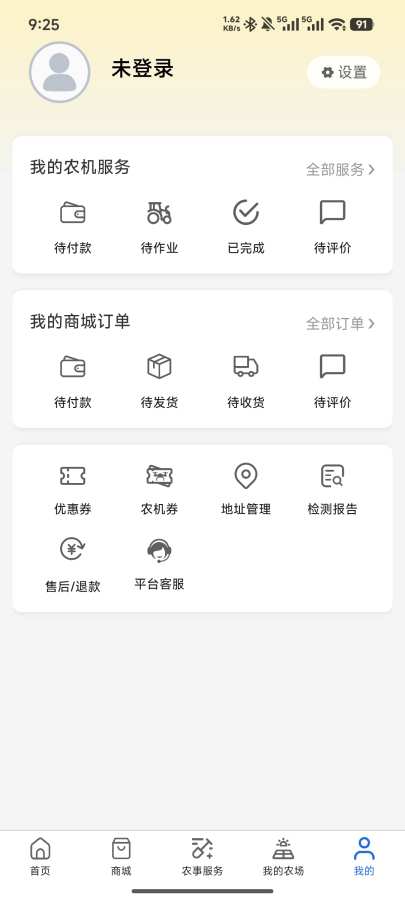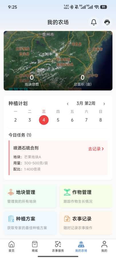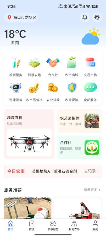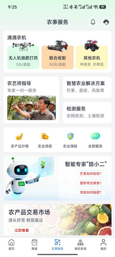 平台首页整合了农业生产全流程的关键功能,用户可实时获取气象信息、农事提醒、农机调度及市场行情等数据。支持无人机植保、农机作业等现代化农事服务的在线预约与管理,推动农业生产从经验导向转向数据驱动。"我的农场"模块帮助用户轻松管理地块信息、记录农事日志、制定种植计划,实时监控作物生长全过程。