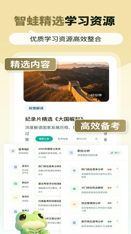 智蛙公考app通过智能化手段革新了传统备考方式,为考生提供全方位的备考支持。从精准的面试模拟到专业的申论批改,从海量学习资源到个性化学习规划,每个功能都针对公考特点精心设计。这款应用不仅能帮助考生高效备考,更能培养真正的应试能力,是公考路上不可或缺的智能助手。