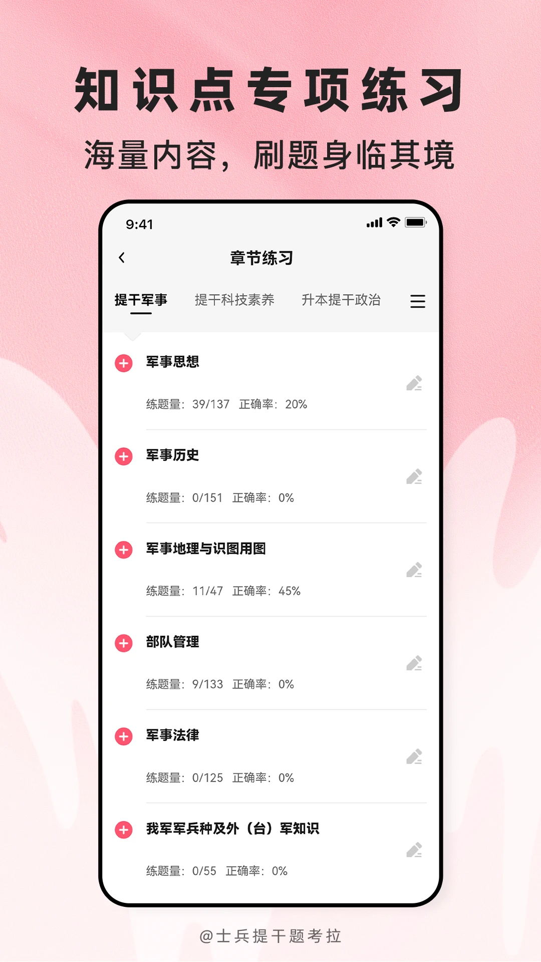 士兵提干题考拉APP是面向优秀大学生士兵提供一站式刷题服务,主要提供的服务包含军考政策、刷题、资料、课程等。