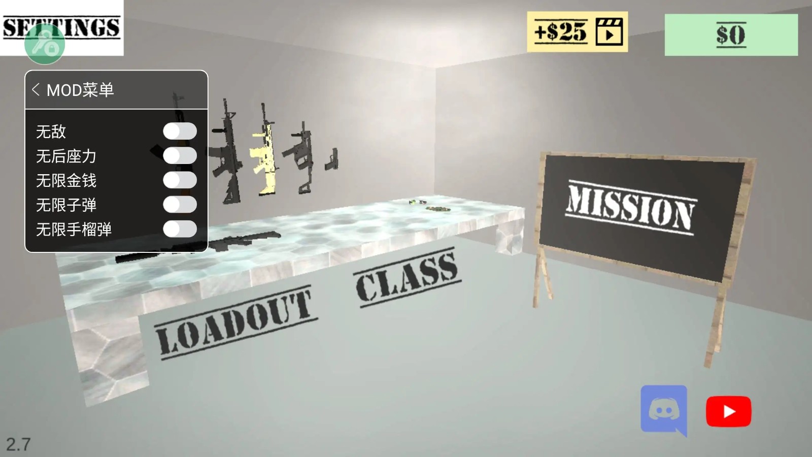 辅助菜单:(无限金钱开启后如无显示,购买枪支后显示)