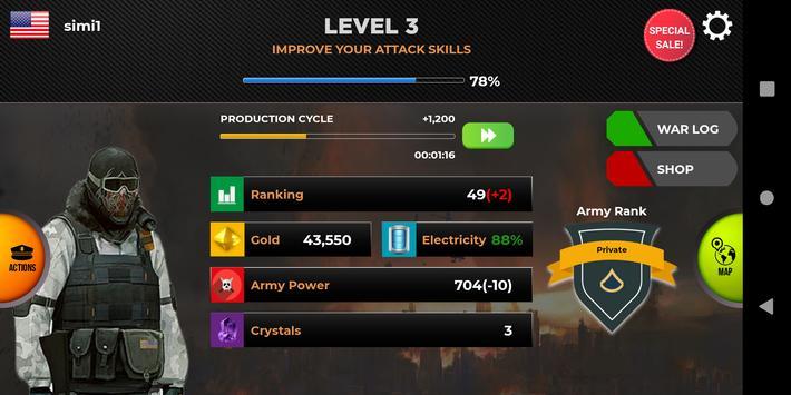军队大亨空闲部队(Army Tycoon)是一款模拟军队进行对战的游戏,玩家将在中科院游戏当中扮演一名优秀的士兵,你的任务就是加入到刺激的战斗当中,各种武器都可以使用,和敌人进行近身对抗的时候就需要保证你的战斗力和体力比对手强才行,这取决于平时的训练,想来挑战这款游戏的话可以来下载!