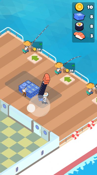 2、雇佣员工捕鱼,搭建一个小厨房,加工成寿司,搭建一个类似旋转火锅的旋转寿司输送平台。