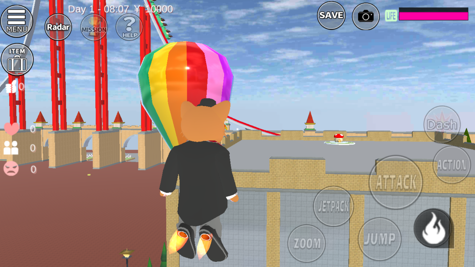 1、游戏界面有方向转盘,滑动滚轮可以进行移动,还有攻击键,蹲下键,可以跳跃,可以吃东西,还可以进行问候,也可以作用喷气背包进行飞行。界面左侧有物品栏和菜单栏,可以放置道具和更改游戏参数设置。右上角的粉色条状是能量显示,在任务框中申领任务,完成任务后获得相应的奖励。