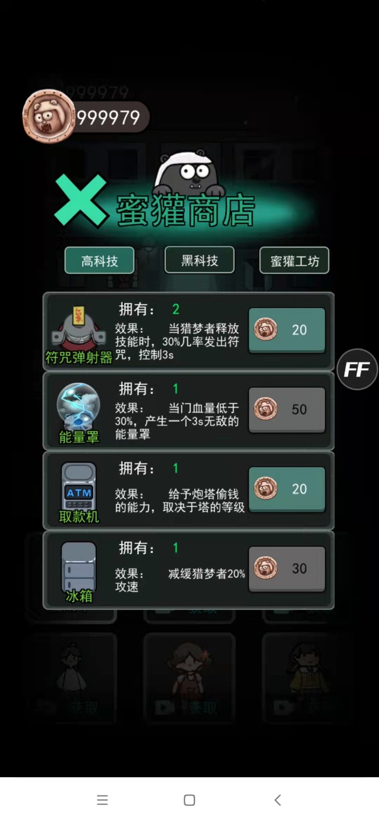 猛鬼加强,无限蜜罐、金币、电力,炮塔攻击力加强,提升炮塔攻击速度,猛鬼狂暴,加快猛鬼进场,维修无CD,免广告获得奖励。