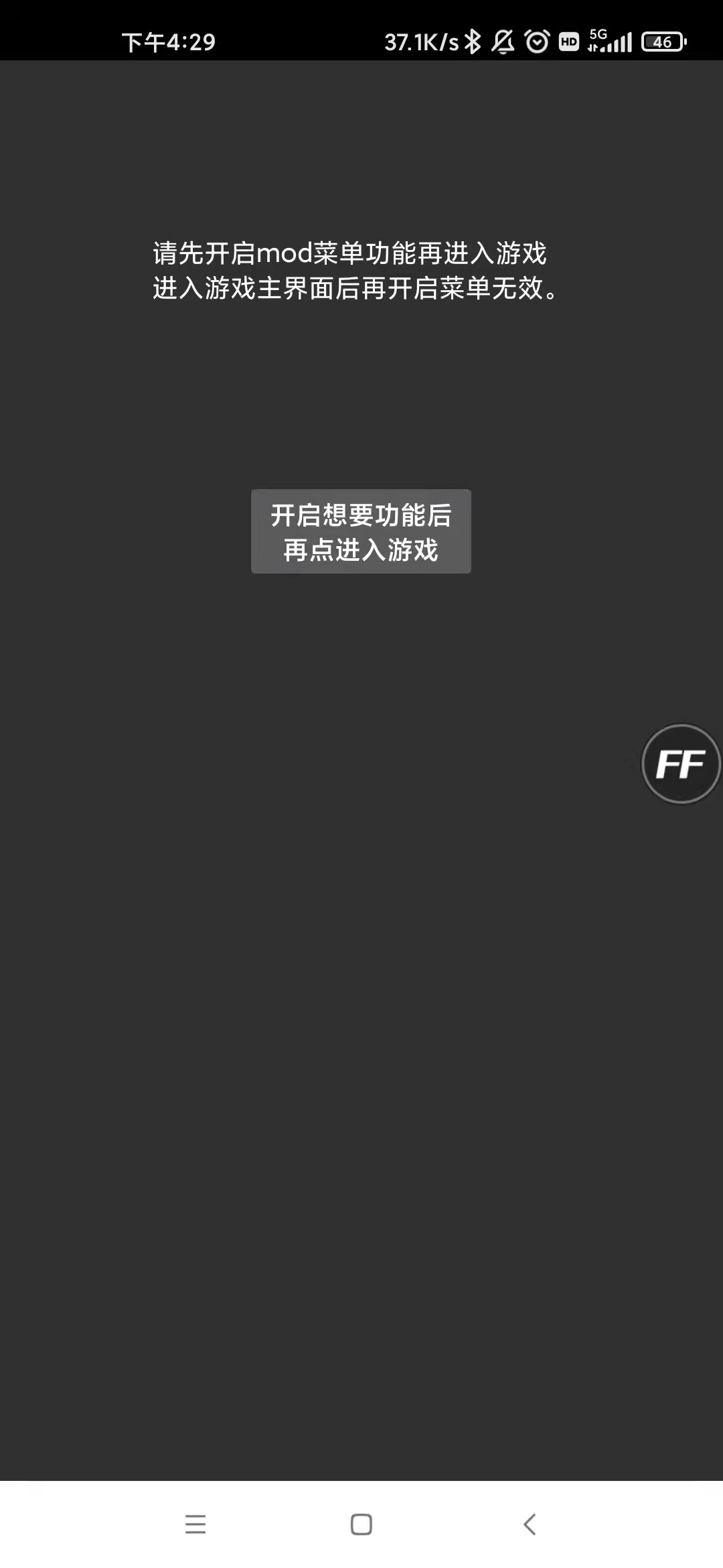 作弊功能需要大家提前在进游戏前通过点击屏幕边的"FF"悬浮窗开启,游戏过程中开启功能没有任何效果的!