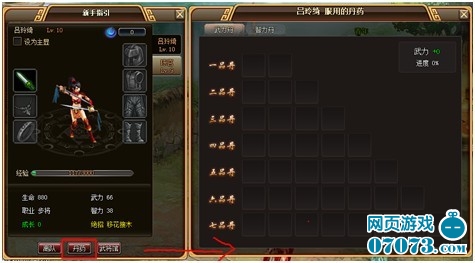 10级通关副本后,开启丹药系统。点开副将面板,下面有一排按钮,再点击丹药,会弹出丹药的面板,副将都可以靠吃丹药提高“武力”和“智力”两种属性。