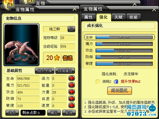 宠物强化将加成宠物的属性值,表现为直接加成升级、加点提升的属性值。每次强化需要消耗一瓶“龙之精华”,该道具可以在支线龙殿和打怪获得。