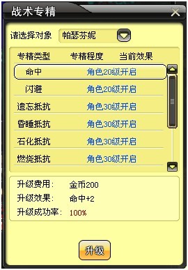 花点时间研究下战术专精,对你是有帮助的。它能够加成角色的修正属性值,间接或直接影响到你的战斗能力。共有10种专精方向(除了命中、闪避、回复、暴击,还有石化抵抗、昏睡抵抗等6种状态抵抗)。