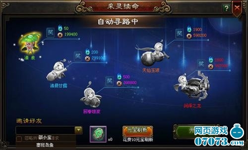 采集的对象分为5种,从“清泉”到“润泽之龙”,所能拿到的奖励越来越多。不过刚开始都是“清泉”,玩家可以根据自己的实际情况,选择通过道具“重生石”或者元宝刷出更高级的采集对象,或者直接花费200元宝采集润泽之龙。