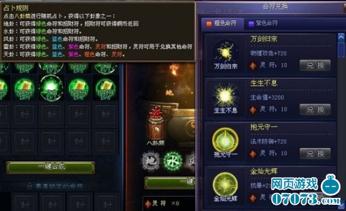 在“八卦筒”里有大概呈现从绿符到橙符的所有命符,固然越高级的呈现的概率越低,或许每花1000万铜钱就能获得一张橙符。不外玩家也可以积攒灵符,然后用灵符来购买橙符。另外,豪气的玩家还能选择“乾坤筒”,这里高级命符呈现的概率极大增加,不外每占一次都要耗费100元宝。