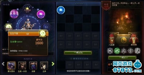 点开画面右下角的“命符”图标可能快捷键J,即可进入占卜系统。这个系统融合了中国传统的占卜元素,古时候人们通过占卜以知休咎,而在这里占卜则可以给武将提供多达8种属性的加成。其中差异职业的脚色偏重点有差异,例如射手就应该优先加“物理攻击”和“暴击”。