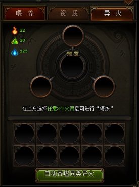 3.精炼:通过点击合成面板的圆框,玩家可以选择任意的一种火灵,当3个圆框内都选择好火灵后,就可以进行精炼,精炼成功就可以获得技能了。