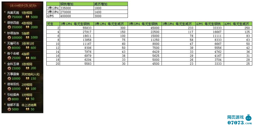 以下表格体现是每1个元宝使用的价值,比如4冲5的时候从35W可以增加到75W。如果使用2个元宝就是用1个元宝搏1/6的机会中20W,也就是说每个元宝的价值是20W除以6等于33333。如果你愿意用1个元宝换33333铜钱 那你就点吧,不用犹豫。当然这个表格数据的准确性是基于发牌出的点数是不是伪随机的基础上的,究竟是不是,我还真不知道。