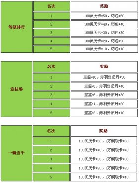 【活动内容】每天0点时封神榜中的竞技场、等级排行榜、一骑当千排行榜的前5名玩家可获得高额的奖励。