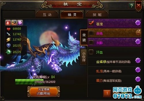 部分坐骑形态还会有额外的专属技能,包括给神射加暴击闪避、给战狂加防御抗暴、给方士加命中法攻等等,化形等级提高后,技能等级也会有相应的提升。