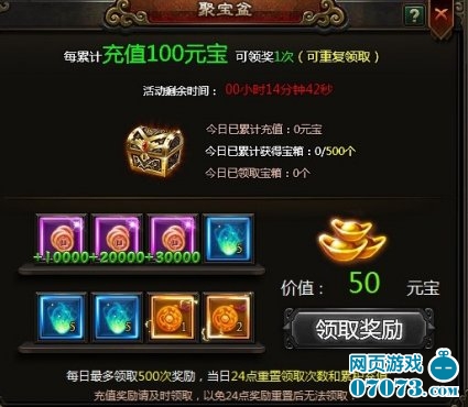 1、活动期间,每累计充值100元宝即可领取一次奖励