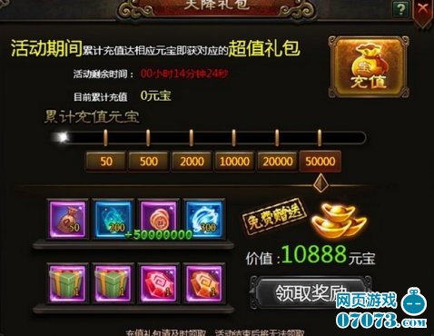 【活动内容】活动期间,累计元宝充值达到一定时,即可领取对应档次的充值大礼包(每个档次的礼包最多领取一次)