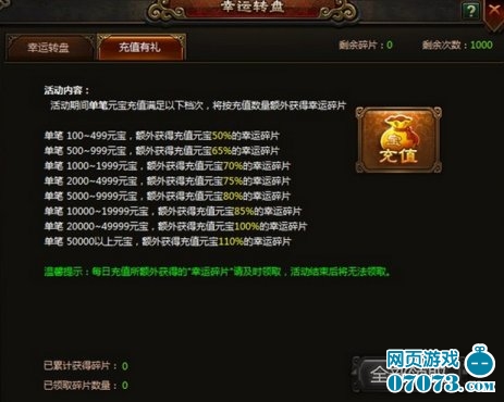 单笔 1000~1999元宝,额外获得充值元宝70%的幸运碎片