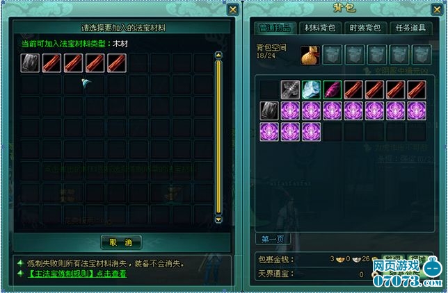 如本次点击的是“木材”按钮,界面将自动跳转至木材材料背包,选择用于炼制的木材材料后将重新返回法宝炼制主界面。如下图红圈处: