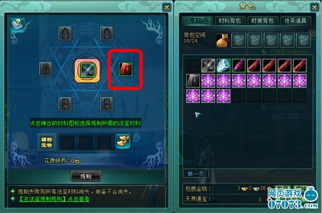 第三步:不同装备进行法宝炼制时,均需要放入3种不同的法宝材料。双击或拖拽背包中对应的材料图片至材料框,或者点击界面中的