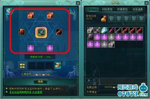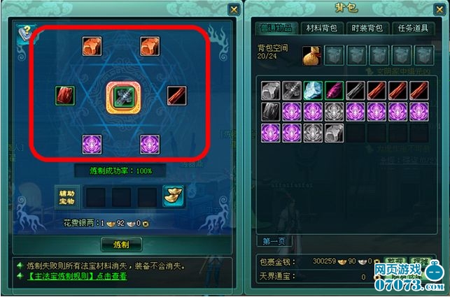 第五步:法宝炼制主界面将显示炼制该法宝的成功率、花费的银两,同时可以在法宝炼制时添加各类辅助宝物。确认无误后,点击炼制即可完成主法宝炼制。