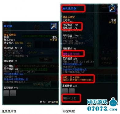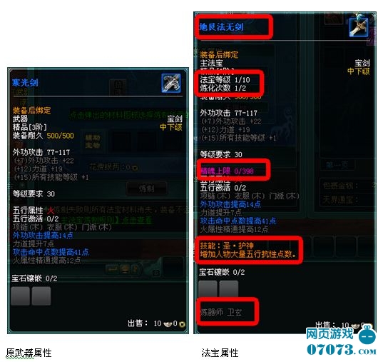 将武器初次炼制成法宝后,武器原有的属性、五行属性、五行激活、鉴定属性不变,将法宝名字将变化和现实为您自定义的法宝名字,同时新增法宝等级、炼化次数、精魄上限、法宝技能、法宝铸造者的角色名相关的功能和显示。如下图红圈处。