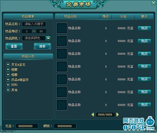 其他信息:显示玩家当前的元宝和非绑铜钱数量,以及2个功能按钮(寄售道具,我的寄售)