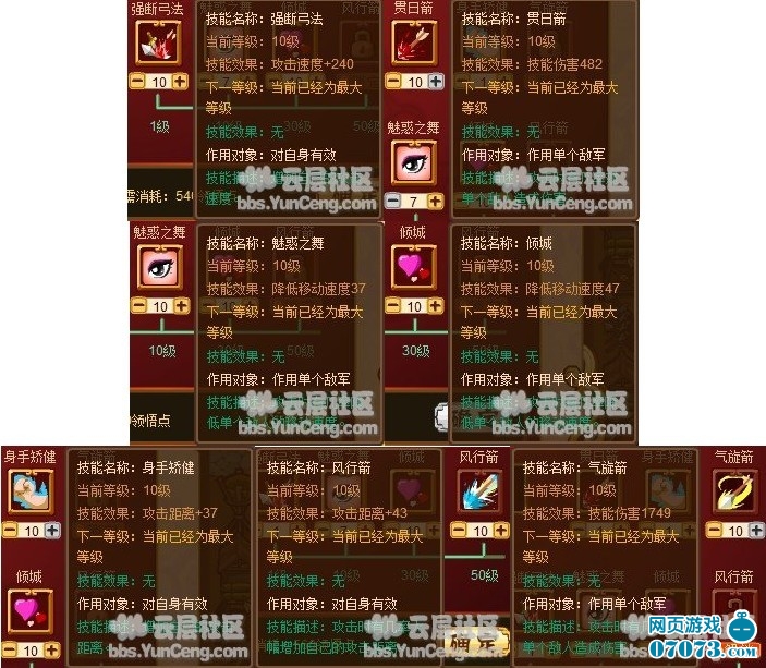技能:强断弓法、贯日箭、魅惑之舞、倾城、身手矫健、风行箭、气旋箭