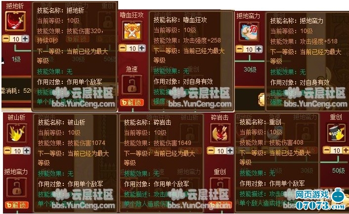 技能:撼地斩、嗜血狂攻、急速、撼地蛮力、破山斩、碎岩击、重创