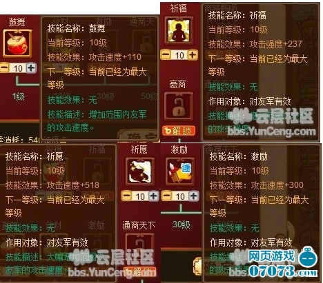 技能:助威、祝福、敛财、指引、激励、天佑、通商天下