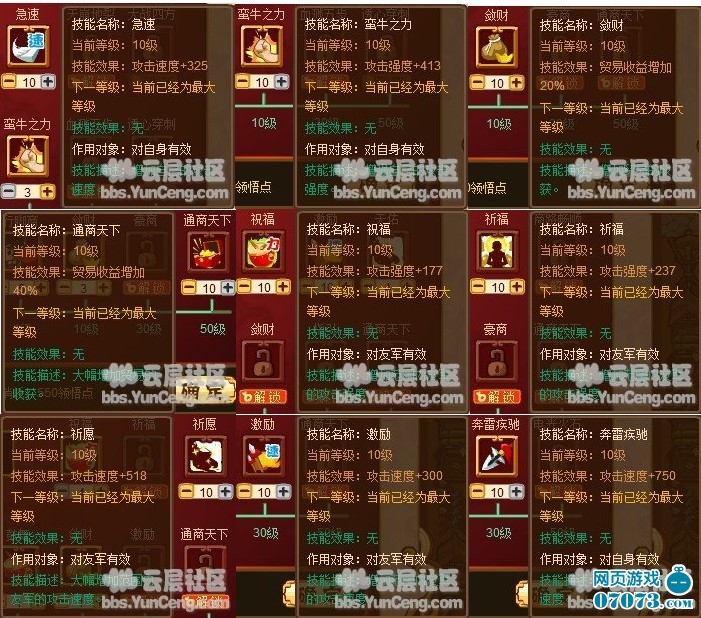 通用技能:急速、蛮牛之力、敛财、通商天下、祝福、祈福、激励