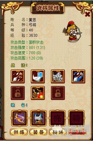 先看这黄忠的属性图,攻击力为801+131=932,如果遇到兵种相克,那么一半的攻击力是466。