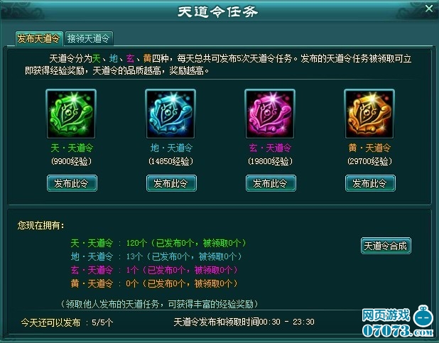 天道令任务可以在天州城【雷帝天君】处领取,每天可以完成5次和发布5次天道令的机会。完成天道令任务或者是自己发布的天道令任务被其他玩家领取都可以获得丰厚的经验奖励。天道令品质分为:绿、蓝、紫、橙,对应品质越高的任务完成或被接去获得的经验奖励就越多。