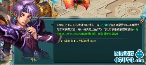 33级以上玩家可以再天州城【徐林】处每天有3次的运镖机会,通过运镖可以获取经验和可观的铜币收入。同时每天15:00~16:00是全服运镖时间,运镖可以获得大量奖励加成,同时还可以和帮会运镖叠加可以获得更加丰厚的奖励!