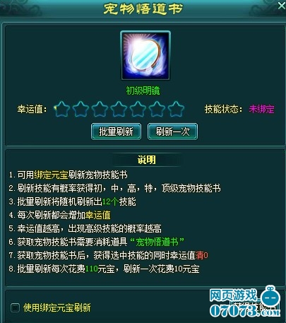 您可以点击刷新一次,或者批量刷新获得初、中、高、特级技能,刷新一次消耗10 元宝出现一个可选技能,批量刷新一次消耗110 元宝,而批量刷新将出现12 个候选技能:
