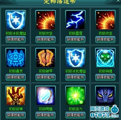 点击获得技能书,您就可以获得该技能了,但是你的宠物想要学会该技能还有两个条件:1 、有宠物悟道书。2 、您的宠物已学会上一级的同类技能: