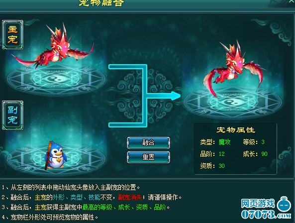 还有一个就是宠物的“融合”功能,可以帮您将副宠中的等级、成长、资质、品阶继承过来(如主宠这些属性高于副宠,则不继承),技能是无法转移的啦,所以大家在融合之前技能把副宠的技能封印起来,免得消失掉了哦: