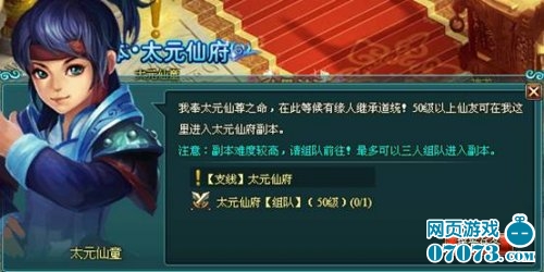 在神魔仙界中,角色到达50级后,可以组队进入“太元仙府”副本,太元仙府可以在天州城找NPC“太元仙童”,点击对话后进入副本。