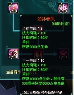如沐春风(10级):回单体技能,恢复10000点生命,有50%的几率额外恢复6000点生命