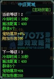 神魔仙界宠物技能中级冥域是宠物技能里的主动技能,该技能主要以群体攻击为主,群体4个,宠物属攻+4%,附加伤害100。