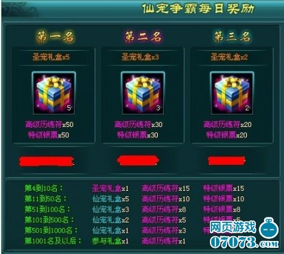 每天0点之后,会根据仙宠争霸的排行榜情况发放奖励。前10名都有圣宠礼盒可以拿,有机会开出特级的成长丹和资质丹,心动了吧~即使排名非常非常靠后也没关系,人人有奖,永不落空。