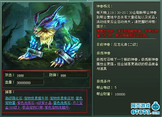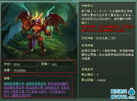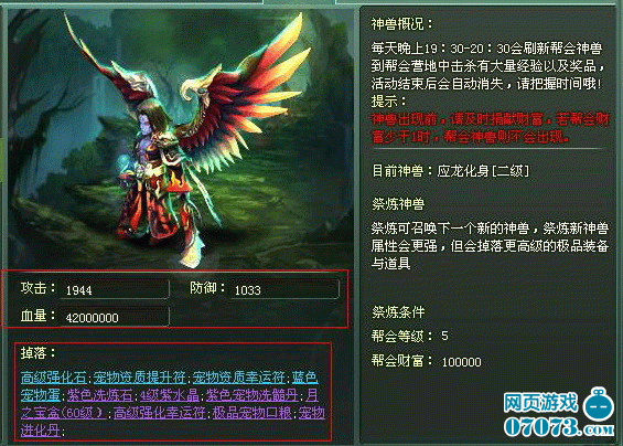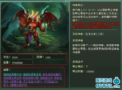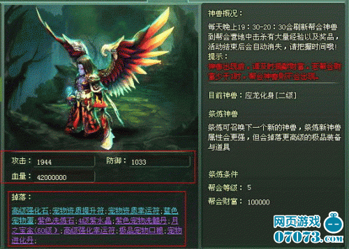 帮会神兽,作为神魔遮天帮派集体的一个重要活动,更是成员们获取经验和顶级装备的一个有效途径。带上你帮会的兄弟,一起挑战帮会神兽吧,帮会神兽一起杀,极品装备天天拿,主要把握得好还是不错的!不过需要提醒的是,要量力而为,当然是越高级的神兽越好,不过若是召唤出太厉害的神兽而没时间的话可就亏了哦!