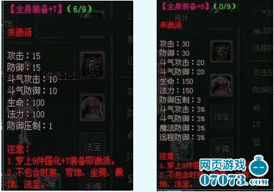 8套有套装属性的职业攻防的3%加成,同时单件装备+8比+7要多0.5%的职业属性.以55级人物为例+7套战力一般是32000,而+8套可以到达36000.可能各位对数据不是太敏感,但有了更高的战力,特别是职业的攻防,可以保证在竟技场中排名前3,如果服内无太强力的玩家,+8套第一绝对无压力.这意味着每天单是竟技就有200多万的经验。目前合服比较快,尽快打BOSS刷60级的至尊是高端玩家的首要任务,和+7套比+8套起码能在打玄武和白虎时节省1/3的时间,多刷到一件60的至尊武器,出售的价格已经能抵消一件装备+8的费用。