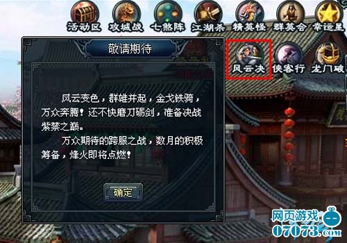 跨服激战风云决 武林人士齐关注!目前,游戏面板内已经添加了跨服战的入口按钮哦,不过内部擂台尚未竣工!请时刻关注《十年一剑》跨服战!
