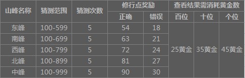 1) “数理猜测”游戏难度按照山峰挑战难度分为五个等级,对应的猜测范围依次增大(具体猜测范围参见下表),山峰挑战难度越高可获得的“思过修行点”奖励越多;