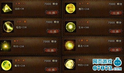 其中,泰坦之力,物攻+216;雷神之魂,魔攻+216;守护之翼,格挡+216;狂暴之魂,暴击+216;神圣之心,物防+216;自然之魂,魔防+216;不灭之魂,生命+500;主神之光,统帅+36。