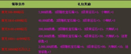 活动描述活动期间,《神曲》用户只要首次充值满足以下额度,即可额外获得超值返还奖励,宝石幸运石倾情送,海量战魂等你拿!