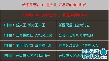 喜迎新服开启,神曲已为您准备了丰富的开服活动助您在这个众神时代的游戏世界里成就您的霸主大业。精彩不断,好礼不停!创世神曲,由你开始,更多精彩开服活动等待你的参与!(详情请点击下方)