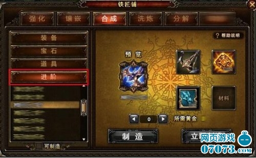 铁匠铺进阶橙色系统3、史诗装备合成需要特殊材料,分别为:对应级别的紫色套装一件、传奇石若干、对应级别的传奇装备碎片若干。