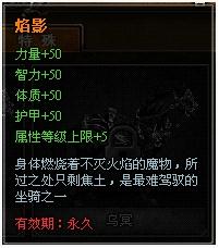 2.焰影:绝版坐骑,只能在端午节活动中兑换。拥有此兽魂,就能享受它的属性加成。